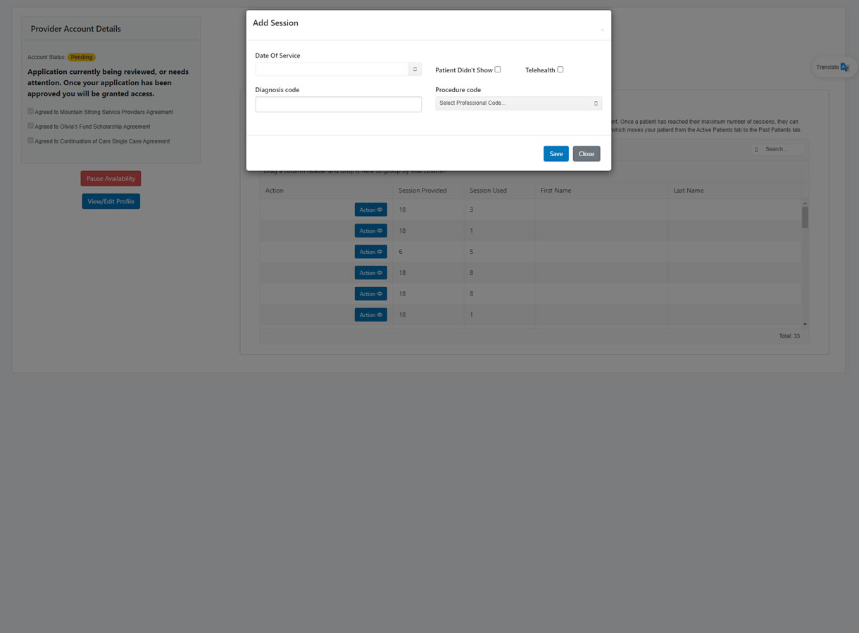 Once you have connected with a patient and provided them either in-person or telehealth sessions you will log all of those sessions on your dashboard. Our administrative staff then takes that information and pays sessions at the end of each month.